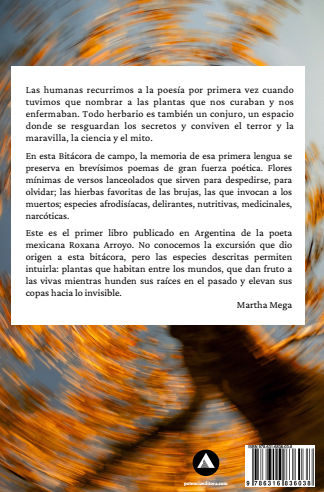 Este es el primer libro publicado en Argentina de la poeta mexicana Roxana Arroyo. No conocemos la excursión que dio origen a esta bitácora, pero las especies descritas permiten intuirla: plantas que habitan entre los mundos, que dan fruto a las vivas mientras hunden sus raíces en el pasado y elevan sus copas hacia lo invisible.